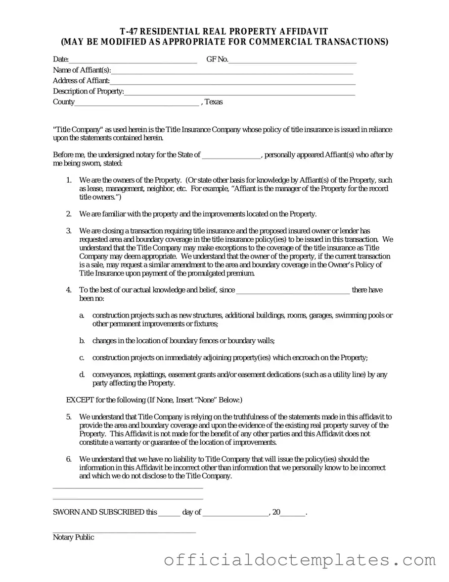 The Texas residential property affidavit T-47 form is a legal document used to affirm the status of a property and its ownership. This form plays a crucial role in real estate transactions, providing essential information to buyers and lenders. Understanding its purpose and requirements can help ensure a smooth property transfer process.